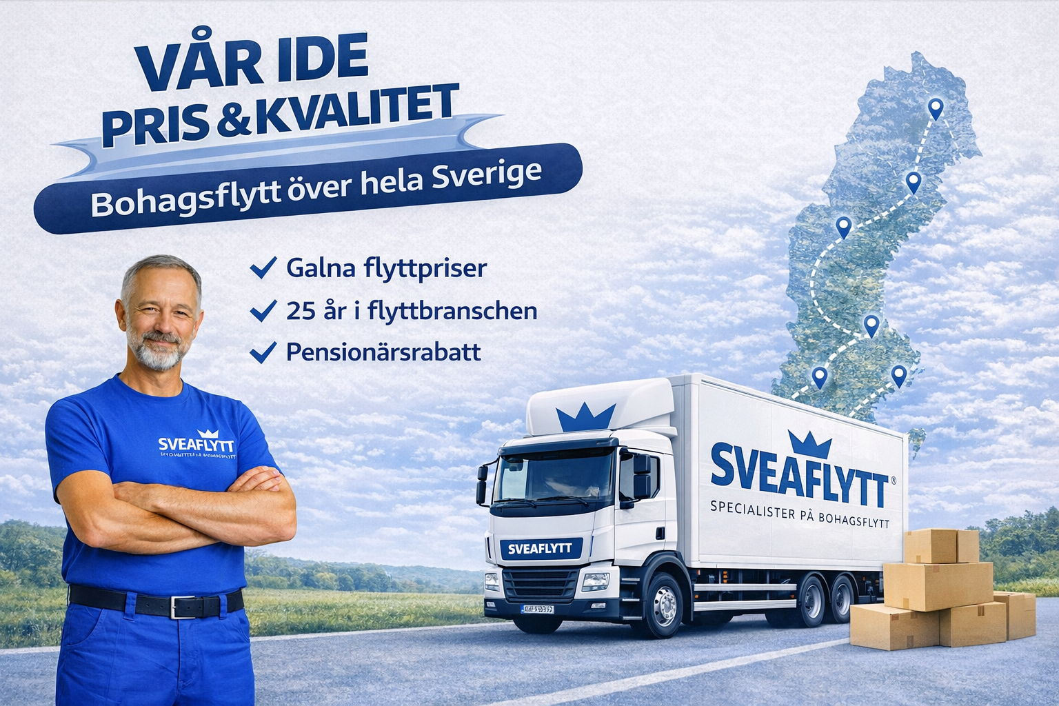 Med över 25 års erfarenhet är Sveaflytt din specialist på prisvärda och säkra bohagsflyttar. Vi erbjuder komplett flyttservice – från packning, transport och bärhjälp till flyttstäd och magasinering – alltid med fasta priser, försäkring och personlig service.